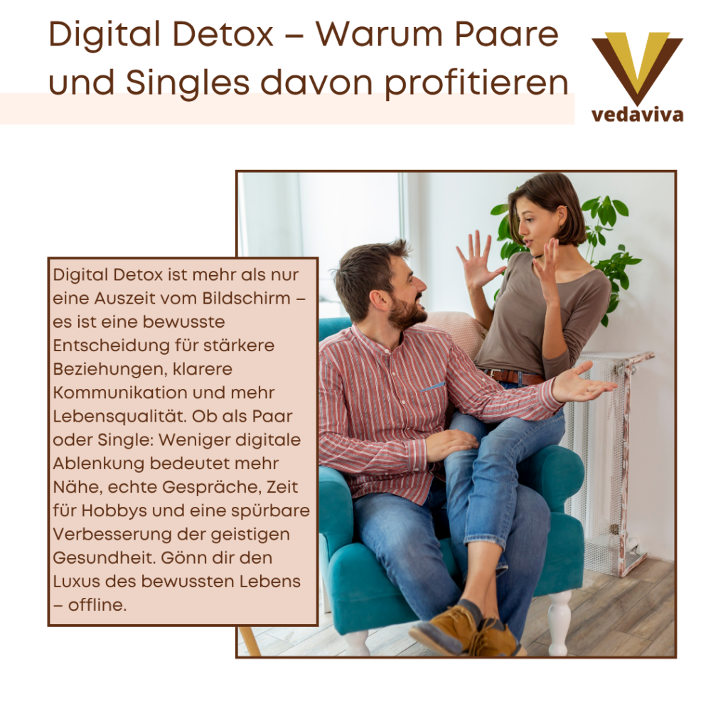 Overall, digital detox for couples and singles can help to improve their relationships and mental health, have more time for hobbies and interests and achieve a better work-life balance. It can also help improve the ability to communicate and live more consciously in the real world.