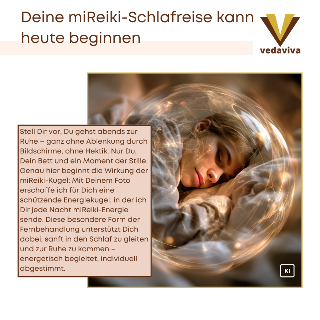 The miReiki sphere is an innovative health concept based on the ancient practice of Reiki. As a miReiki Master, I send miReiki energy to you every night and place you in an energetic sphere. Imagine lying in a stable soap bubble and having such protection around you. This miReiki sphere ensures deep relaxation and restful sleep - all from a distance, just with the help of a photo of you and your address where you sleep.